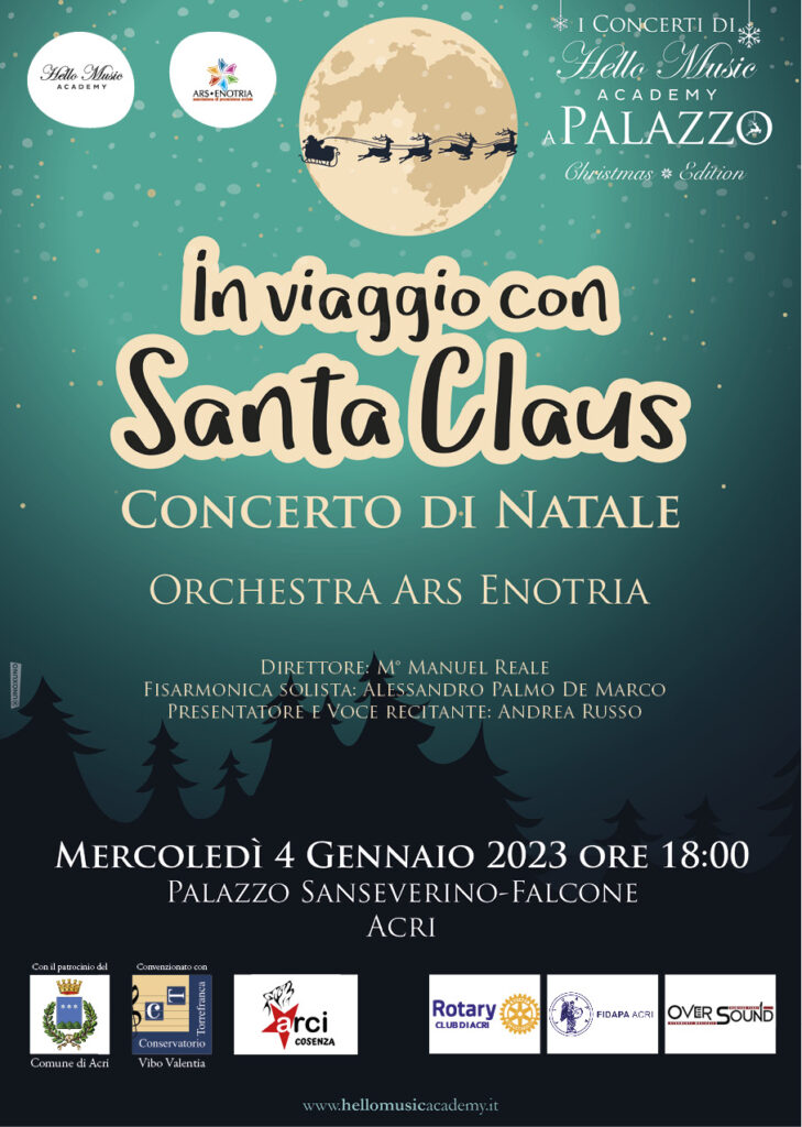 Si terrà Mercoledi 4 gennaio 2023 il secondo concerto del periodo natalizio nel corso de “I Concerti di Hello Music Academy a Palazzo”. L’Orchestra Ars Enotria ha accettato con grande rispetto la volontà di rimandare ad una nuova data lo spettacolo “In viaggio con Santa Claus” diretta dal M° Manuel Reale, Fisarmonica solista Alessandro Palmo De Marco, Presentatore e Voce recitante Andrea Russo.