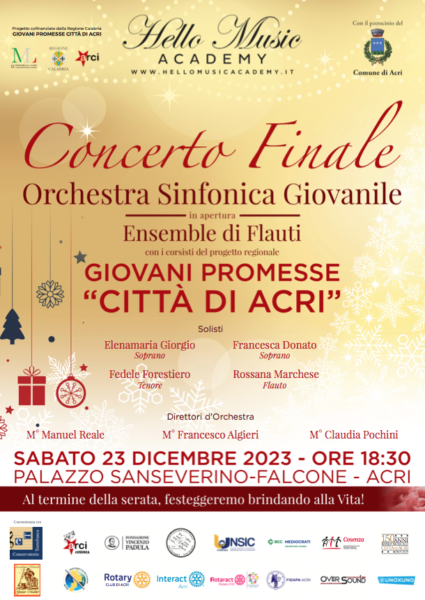 Il concerto di questa sera vede protagonisti in apertura l’Ensemble dei Flauti curati dal maestro Claudia Pochini e, insieme all’orchestra, le splendide voci di Francesca Donato, Elenamaria Giorgio e Fedele Forestiero; una straordinaria partecipazione per uno speciale brindisi natalizio che la Hello Music Academy offre a tutta la città di Acri, con la degustazione dei tradizionali “cullurielli”.