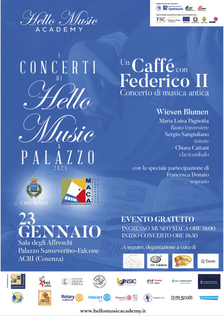 Martedì 23 gennaio 2024 alle ore 18:00, nella prestigiosa cornice della Sala degli Affreschi di Palazzo Sanseverino Falcone di Acri, con il patrocinio dell’Amministrazione Comunale e del Museo Maca, avrà luogo il concerto di musica antica dal titolo “Un Caffè con Federico II”.