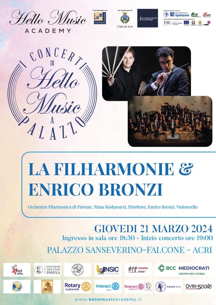 Ancora una volta la Hello Music Academy APS propone un concerto che si preannuncia straordinario. Il grande violoncellista Enrico Bronzi con la prestigiosa Orchestra “La Filharmonie” di Firenze, diretta da Nima Keshavarzi. Il Concerto previsto per il prossimo giovedì 21 marzo nella Sala Consiliare di Palazzo Sanseverino