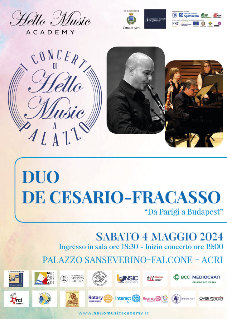 Sabato 4 maggio 2024 avrà luogo presso il Palazzo Sanseverino-Falcone alle ore 19,00 un concerto del duo composto dal clarinettista Fernando De Cesario e dal pianista Luigi Fracasso.