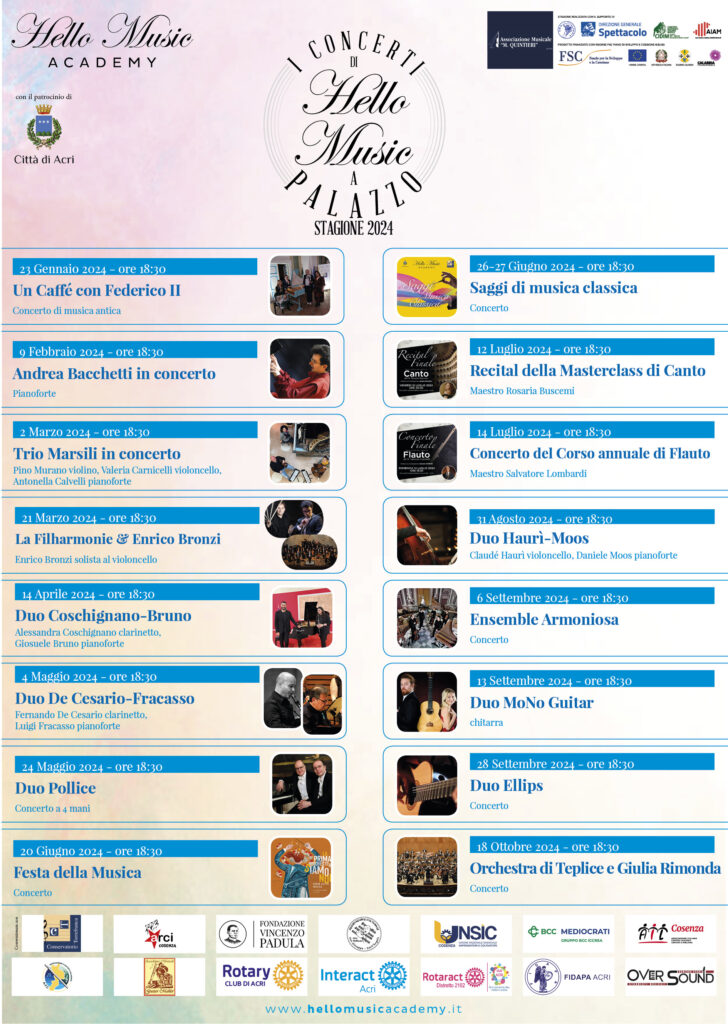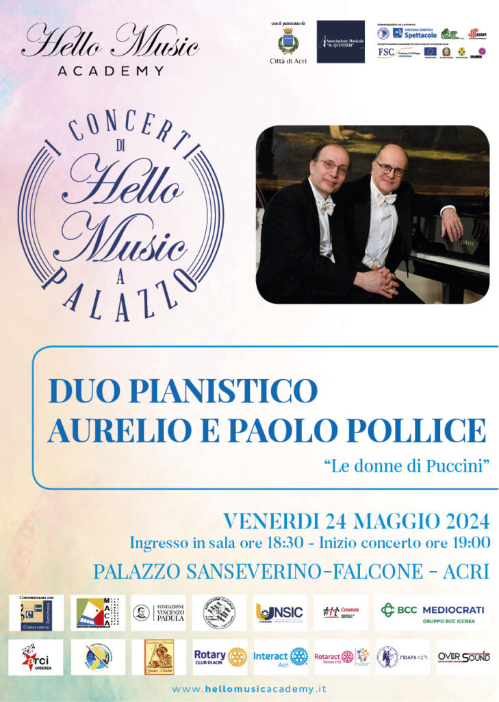Il settimo appuntamento della stagione 2024 “I Concerti di Hello Music a Palazzo” prevede un concerto imperdibile dove grande protagonista è il duo pianistico dei virtuosi Aurelio e Paolo Pollice. Si tratta di un evento organizzato dalla Hello Music Academy in collaborazione con la storica Associazione “Maurizio Quintieri” di Cosenza, con il patrocinio dell’Amministrazione Comunale di Acri, con il sostegno del Ministero della Cultura Direzione Generale Spettacolo e dell’Assessorato alla Cultura della Regione Calabria, in sinergia con AMA Calabria, Conservatorio “F. Torrefranca” di Vibo Valentia, Arci Cosenza, Accademia Musicale G. Mahler, Museo MACA, Fondazione V. Padula, Rotary Club Acri, Rotaract, Interact, Fidapa, Coro Polifonico San Giuseppe, BCC Mediocrati, Unsic, Ail Cosenza e Oversound.