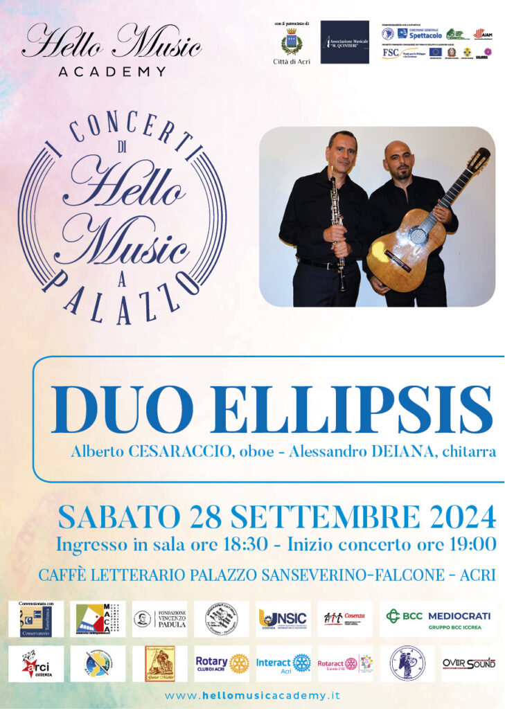 Sabato 28 settembre alle ore 18:30, nella sala del Caffè Letterario di Palazzo Sanseverino-Falcone di Acri, avrà luogo il concerto del Duo Ellipsis, oboe e chitarra, con il patrocinio dell’Amministrazione comunale.