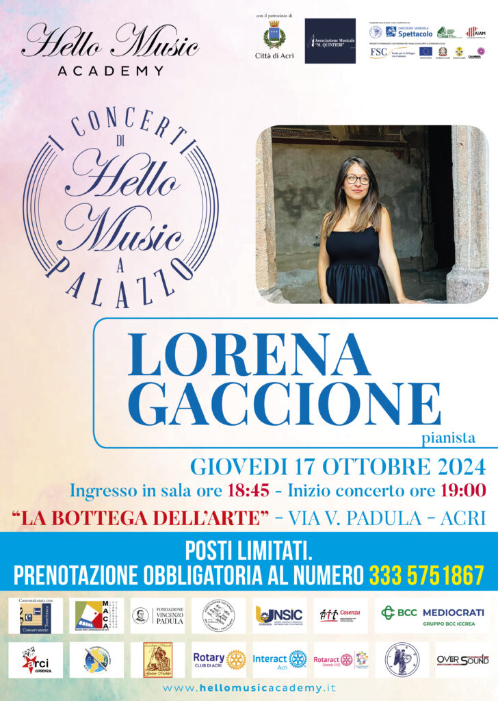 Lorena Gaccione, pianista, in concerto giovedi 17 ottobre 2024, alle 19.00 presso “La Bottega dell’Arte”, via V. Padula – Acri (CS).