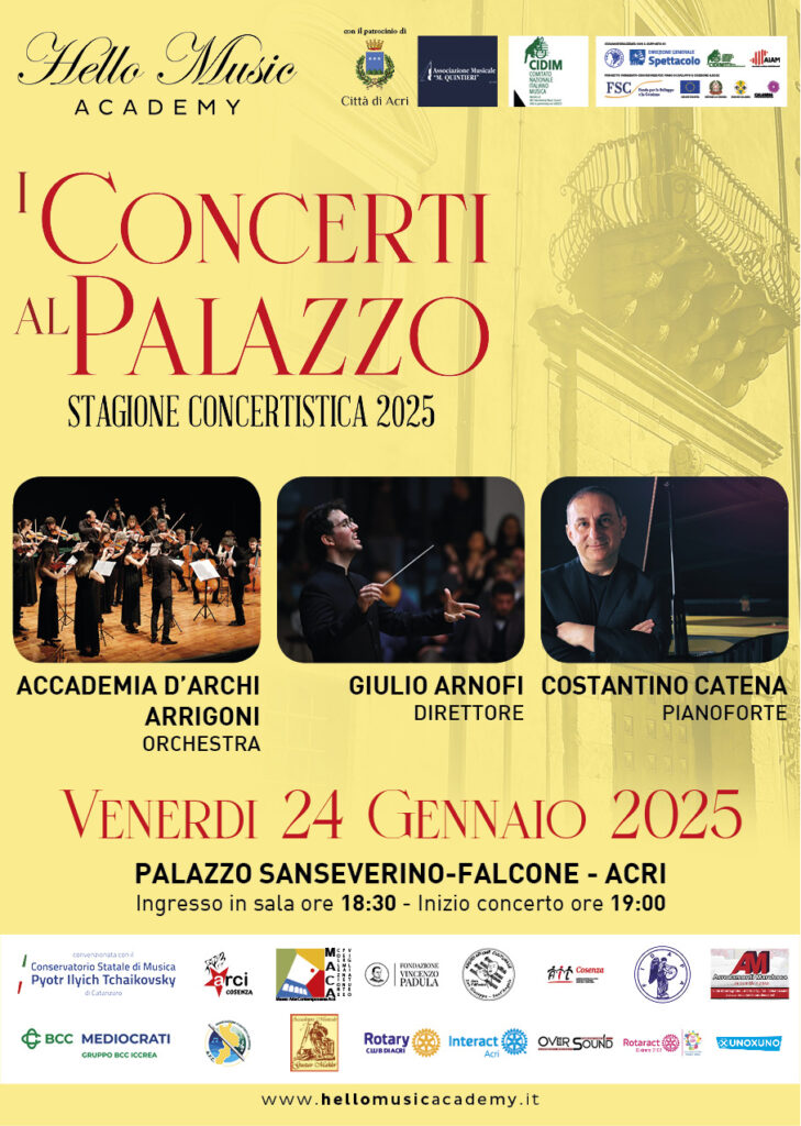 Prende avvio la nuova stagione concertistica 2025 de “I Concerti di Hello Music a Palazzo”, un cartellone pieno di eventi musicali di grande spessore artistico con nomi di elevata caratura. Venerdì 24 gennaio alle ore 18:30, nella Sala Consiliare di Palazzo Sanseverino-Falcone di Acri protagonisti saranno il pianoforte di Costantino Catena e l’Accademia d’Archi Arrigoni, magistralmente diretti dal Maestro Giulio Arnofi. Ancora una volta la Hello Music Academy APS, in perfetta sinergia con la Società dei Concerti di AMA Calabria, propongono un concerto che si preannuncia straordinario, con il patrocinio imprescindibile dell’Amministrazione Comunale di Acri. Si tratta di un progetto in esclusiva per la Calabria e promosso dal CIDIM (Comitato Nazionale Italiano Musica), permettendo alla grande musica una veicolazione importante, soprattutto per il pubblico che nel tempo sta diventando affezionato.