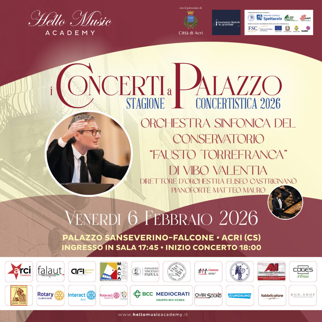 Venerdì 6 febbraio 2026 alle ore18,00 presso il Palazzo Sanseverino Falcone di Acri avrà luogo un concerto con l’Orchestra sinfonica del Conservatorio Statale di Musica Fausto Torrefranca di Vibo Valentia diretta dal Maestro Eliseo Castrignanò con la partecipazione in qualità di solista del giovane pianista Matteo Mauro. L’evento è organizzato dal Conservatorio hipponiano e da AMA Calabria con la collaborazione dell’Associazione Hello Musica.