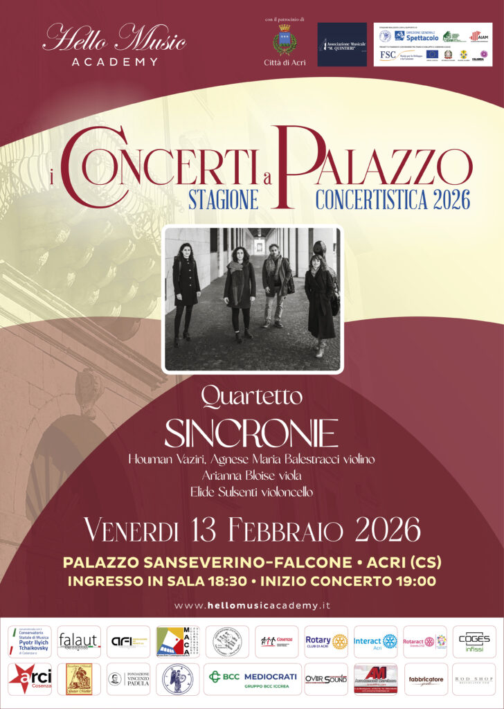Venerdì 3 febbraio 2026 sarà di scena nella sala consiliare di Palazzo Sanseverino Falcone il Quartetto d’archi “Sincronie” alle ore 19:00.