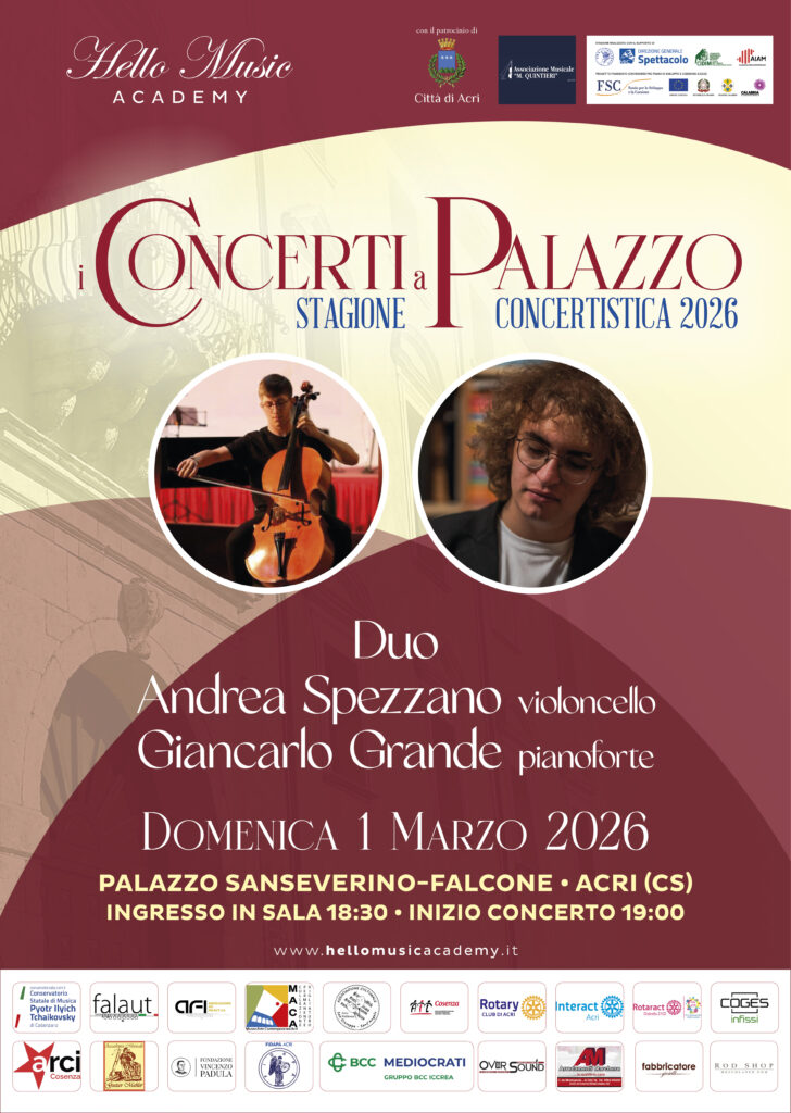 Domenica 1 marzo 2026, nella sala consiliare di Palazzo Sanseverino-Falcone di Acri, avrà luogo il concerto del Duo Spezzano-Grande, violoncello e pianoforte, con il patrocinio dell’amministrazione comunale.