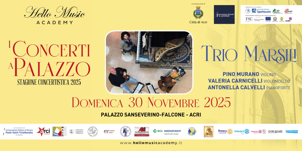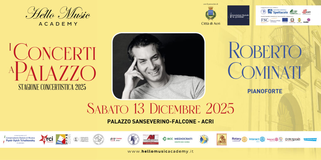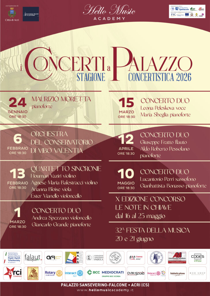 Domenica 15 marzo 2026 la stagione de I Concerti di Hello Music a Palazzo prevede un viaggio attraverso l’Europa con lieder e arie da camera scritte tra Ottocento e Novecento. Il Concerto proposto dalla Hello Music Academy, con il patrocinio dell’Amministrazione Comunale di Acri e in sinergia con l’Associazione Musicale Maurizio Quintieri di Cosenza, con tutte le realtà associative del territorio e con il sostegno della BCC Mediocrati, avrà luogo nella storica cornice di Palazzo Sanseverino Falcone, nella ormai nota Sala Consiliare.